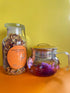 This gift set includes a full jar of Turmeric Tonic Tea and a Neo glass Iridescent Teapot with a built-in french press strainer.